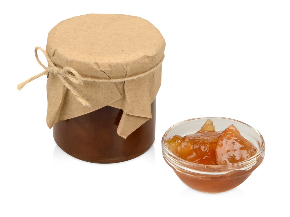 Банка варенья обернута крафт-бумагой, на которую возможно сделать нанесение корпоративного логотипа. Цифровая печать (наклейка на белой пленке) на данный товар осуществляется бесплатно. Оплачивается только настройка оборудования в размере 1100 рублей на весь тираж.