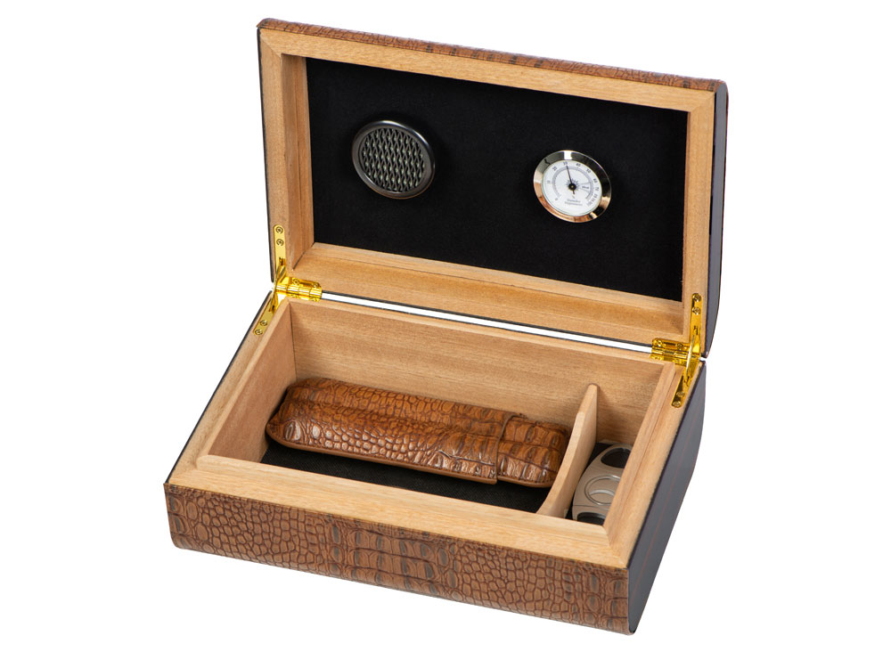Прекрасный подарок для ценителей сигар. Хьюмидор в комплекте с аксессуарами для хранения и курения сигар придется по вкусу успешным бизнесменам. В комплект входят хьюмидор, футляр и нож для сигар, гигрометр и увлажнитель.