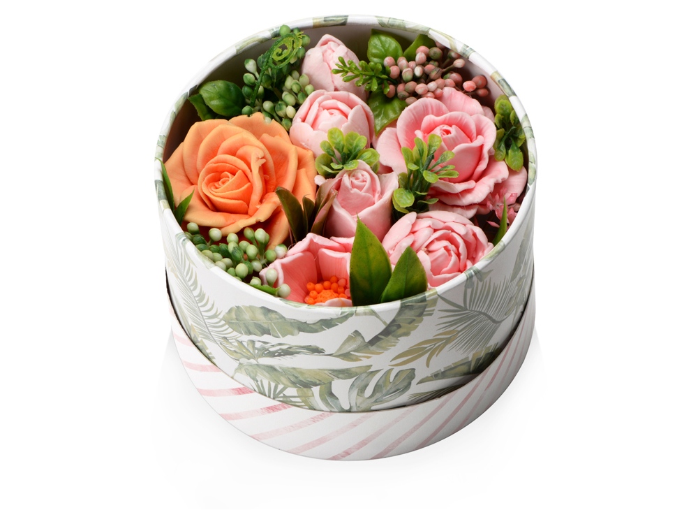 Впечатляющая и изысканная композиция из мыла ручной работы в подарочной коробке. В основе - яркие и реалистичные цветы с нежным ароматом. В композиции также использован флористический декор. Цифровая печать (наклейка на белой пленке) на данный товар осуществляется бесплатно. Оплачивается только настройка оборудования в размере 1100 рублей на весь тираж.