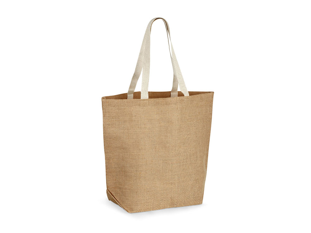 Джутовая сумка для покупок (360 г/м2) , ламинированная внутри, с ручками длиной 60 см. Термотрансфер (1 цвет (цветные изделия)) на данный товар осуществляется бесплатно. Оплачивается только настройка оборудования в размере 10000 рублей на весь тираж.